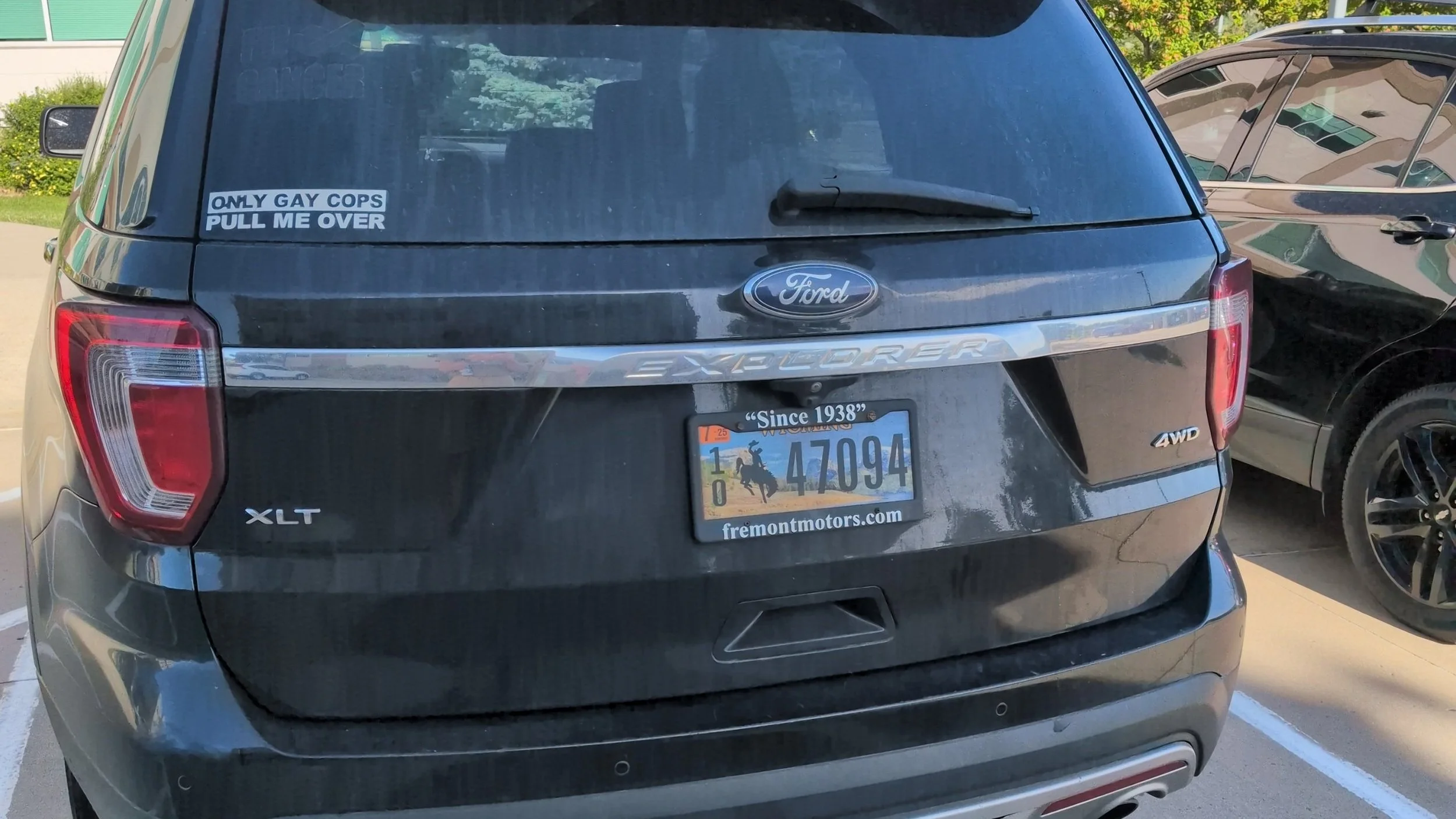 I saw this Wyoming plated vehicle, with an “ONLY GAY COPS PULL ME OVER” window sticker. What message are they trying to send? It seems pejorative, and aggressive. If a non-gay cop did pull them over, would they take this as an attack on their manhood (or sexual orientation if a female cop)? That would seem to be the point. Any other interpretation would be a stretch in credulity. The fact that it is a Wyoming license plate is probably why I took the picture and am disgusted. I am well aware of Mathew Shepard’s death in Wyoming, as should be every other informed citizen. He was a slightly built young gay man, left to die by the side of a highway in Wyoming, after being attacked for being just who he was. Why does a person’s sexual orientation, or even sexual identity affect another person personally? Religious arguments fall flat with me as if God doesn’t create man in his own image… but only sometimes? And the number of animals that have “gay sex” is now quite high, but not without its controversies and nuance. Still, I suspect while people may try to rationalize a reason to be anti-gay, it strikes me as simply emotional and an offense to their sanctity/or a degradation as from these pillars of morality. I believe people have the right to have different views, and espouse them, but I also don’t think advocating for violence is a way to solve many problems. Granted, the window sticker doesn’t do so, but is it a backwards way of saying they condone the violence done to Mathew Shepard? If, by chance the owner of this vehicle comes across this blog post, tell me why you hate!